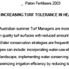 Increasing Turf Tolerance in Heat As we enter the Australian summer Turf Managers are increasingly being asked to maintain quality turf surfaces with reduced amount sand quality of water. Water conservation strategies are frequently practiced and these strategies can include: incorporating water-use-efficient material into the landscape, implementing water conserving management practices, and maximizing irrigation efficiency by reducing leaching, pooling or ponding of irrigation water and surface water runoff. |